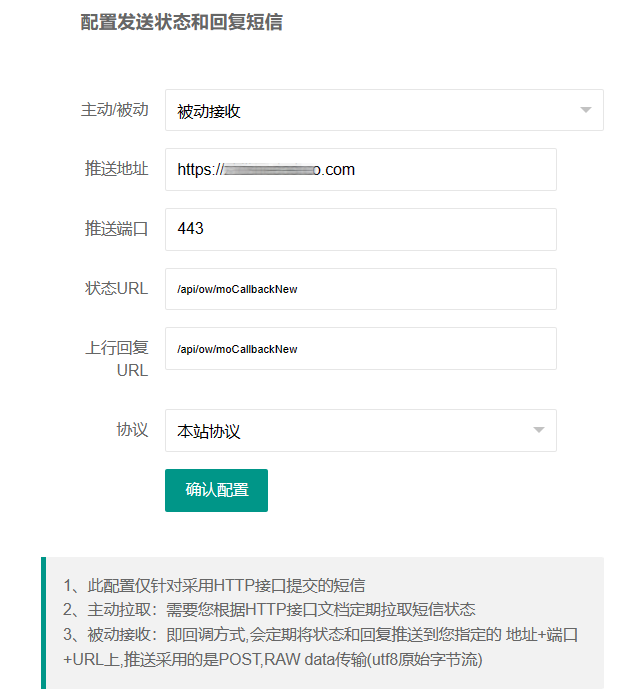 3、被动接收:即回调方式,会定期将状态和回复推送到您指定的 地址+端口+URL上,推送采用的是POST,RAW data传输(utf8原始字节流)