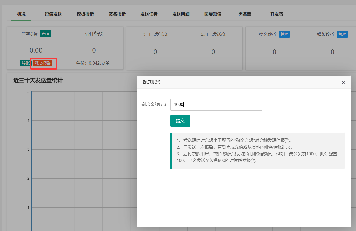 发送短信时余额小于配置的"剩余金额"时会触发短信报警。